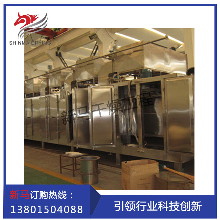 整臺設備為全封閉型(對物料而言),加料系統、熱風系統、出料系統和排濕系統五部分組成。加料段作用使物料均勻分散在網板上,并且勻速輸送到干燥段;熱風系統是提供干燥所需的熱源,提供約150℃熱風至干燥室;在輸送帶通過時,熱空氣從上往下或從下往上通過輸送帶上的物料,從而使物料能均勻干燥,由出料段排出。
